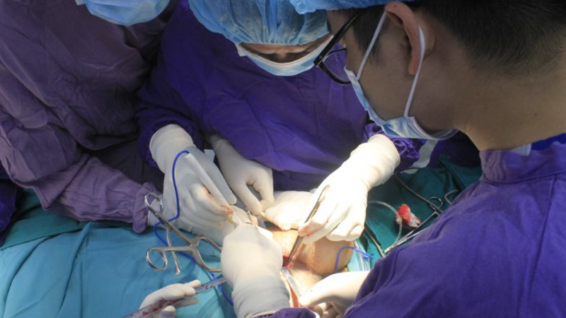 Trên bàn mổ, các chỉ số sinh tồn bệnh nhân rất nguy kịch, huyết áp tụt rất thấp. Các bác sĩ nhanh chóng hồi sức tim, đặt đường truyền tim mạch trung tâm, dùng thuốc adrenaline để duy trì huyết áp, thiết lập ngay hệ thống tuần hoàn ngoài cơ thể.