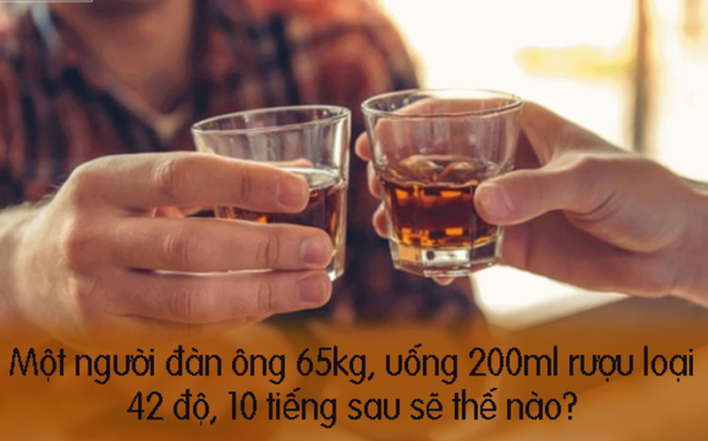 Ví dụ, một người đàn ông nặng 65kg, uống 200ml rượu trắng loại 42 độ, uống xong lúc đồng hồ chỉ 10 giờ đêm và đi ngủ. Nếu thức dậy vào lúc đồng hồ chỉ 7 giờ sáng thì nồng độ cồn là bao nhiêu? Và đến khi nào thì không còn nồng độ cồn trong máu