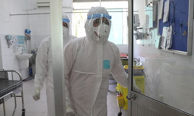 Các bác sĩ Bệnh viện Chợ Rẫy mặc trang phục bảo hộ trước khi vào phòng cách ly bệnh nhân viêm phổi. Ảnh: Hữu Khoa. |