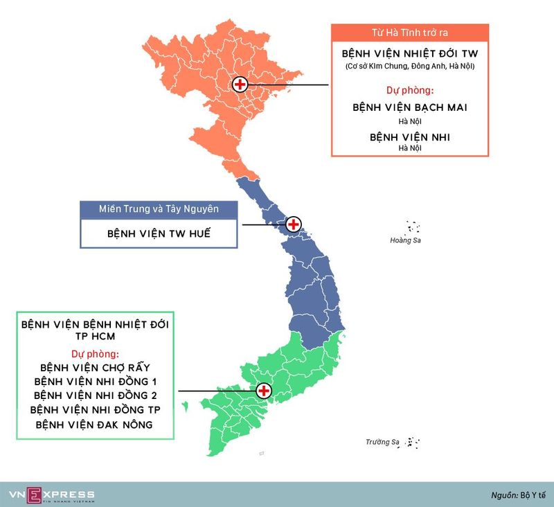 Bệnh viện Bệnh Nhiệt đới Trung ương, Bệnh viện Trung ương Huế, Bệnh viện Bệnh Nhiệt đới TP HCM là các cơ sở chính tiếp nhận bệnh nhân ở ba miền.
