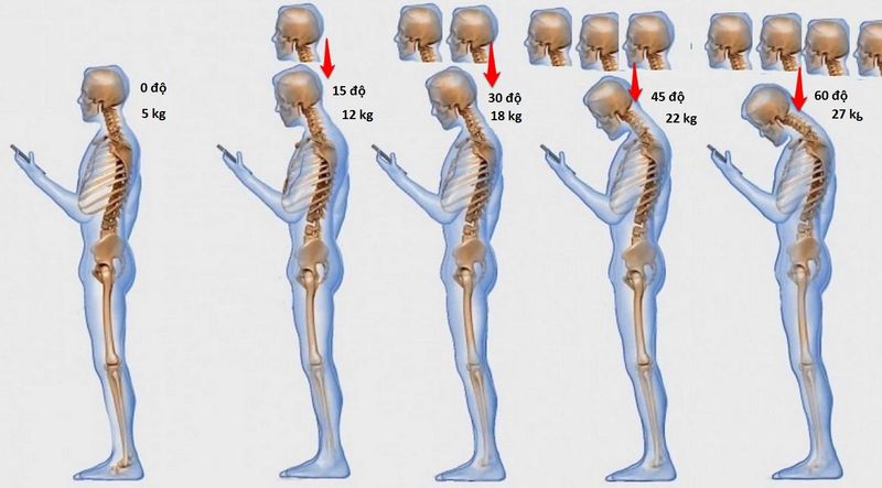 Điện thoại còn có thể gây đau mỏi, tê bì vai gáy, thậm chí nặng nề hơn là thoái hóa cột sống. Gánh nặng lên cổ tăng gấp 5 lần nếu sai tư thế. Cổ là nơi chịu sức nặng của toàn bộ phần đầu. Kết cấu hoàn hảo giúp cổ chịu được trọng lượng của đầu mà không gây nhiều ảnh hưởng đến các cấu trúc bên trong. Tuy nhiên điều này chỉ đúng nếu bạn giữ tư thế chuẩn. Một nghiên cứu cho thấy nếu sai tư thế, cột sống cổ có thể chịu thêm trọng lượng tương đương với 4 cái đầu nữa. Thật khó tin, nhưng nghiên cứu đã chỉ ra. Ở góc 0 độ, cột sống cổ chỉ phải chịu trọng lượng khoảng 5kg. Tuy nhiên, nếu bạn cúi đầu và tạo một góc 60 độ, cột sống cổ sẽ phải hứng chịu trọng lượng gấp hơn 5 lần. Sẽ không để lại hậu quả gì nếu bạn chỉ đơn thuần cúi đầu xuống nhìn vật gì bên dưới rồi ngẩng lên ngay. Tuy nhiên nếu tình trạng sai tư thế kéo dài hàng giờ đồng hồ, từ ngày này qua ngày khác, cột sống cổ sẽ bị tổn thương vì chịu áp lực lơn lâu ngày. Điều này rất phổ biến trong xã hội hiện đại, đặc biệt là vì nhiều người đã nghiện smartphone, mỗi hàng nhắn tin, chơi game lướt web… hàng giờ đồng hồ. Có thể ngay bây giờ bạn chưa nhận ra tác hại của thói quen này, song về lâu dài tư thế cổ sai có thể dẫn đến những hậu quả không hề nhẹ, thậm chí là tổn thương vĩnh viễn, ảnh hưởng nhiều đến cuộc sống thường nhật như: - Thường xuyên đau đầu, đau mỏi vai gáy, co cứng cơ vùng vai gáy và lưng gây ảnh hưởng đến chất lượng cuộc sống cũng như công việc. - Nếu đám rối thần kinh cánh tay bị chèn ép, có thể gây tê bì, đau từ cổ lan qua vai xuống tay. - Nghiêm trọng nhưng hiếm khi xảy ra là tình trạng thoái hóa cột sống cổ, thoát vị đĩa đệm, chèn ép tủy cổ gây liệt tay, chân, thậm chí gây rối loạn chức năng hô hấp. - Đặc biệt trẻ em là đối tượng hay bị sai tư thế, có thể gây tổn thương cột sống cổ vĩnh viễn, khiến trẻ bị đau nhức cổ suốt đời. Biện pháp phòng chống khá đơn giản, chỉ cần chú ý một chút là bạn có thể tránh được những khó chịu về sau: - Nguyên tắc là bạn phải cố gắng giữ cổ thẳng ở tư thế bình thường, tránh gập cổ thời gian dài. - Giữ điện thoại, máy tính, máy tính bảng ở ngang tầm mắt. - Đưa mắt xuống nhìn điện thoại, thay vì cúi đầu để nhìn. - Không nên sử dụng máy tính, điện thoại liên tục. Nên nghỉ ngơi sau mỗi 20-30 phút sử dụng và kết hợp đi lại xung quanh cho cột sống được thư giãn.