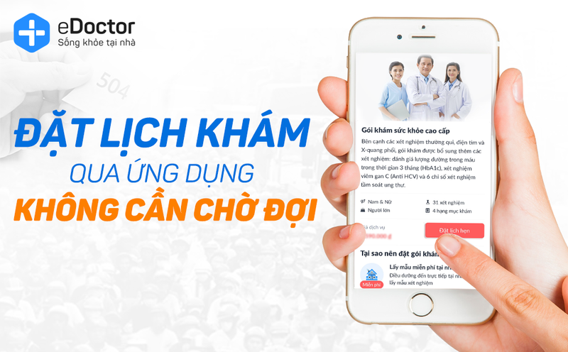 - Bạn chỉ cần đặt lịch hẹn qua Fanpage eDoctor, App, Website hoặc Hotline, điều dưỡng sẽ đến TẬN NHÀ lấy mẫu, Bác sĩ tư vấn kết quả qua điện thoại và kết quả được lưu trữ online miễn phí.