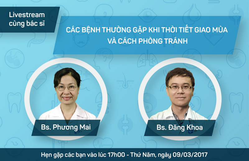 Bạn có những thắc mắc về sức khỏe chẳng biết hỏi ai, trên mạng thì quá nhiều thông tin? Cách phòng tránh đau xương khớp cho người cao tuổi khi trời trở lạnh? Mẹo giúp mẹ thoát khỏi nỗi sợ hãi khi con bị cảm cúm triền miên? Tất tần tật những vấn đề sức khỏe bạn quan tâm về các bệnh khi giao mùa sẽ được các bác sĩ giải đáp tận tình nhất. Đừng quên vào fanpage eDoctor để xem Bs Nguyễn Thị Phương Mai và Bs Bùi Đăng Khoa tư vấn sức khỏe trực tiếp vào chiều nay, lúc 17h Thứ năm 09/03/2017 nhé! Chủ đề livestream tuần này: Các bệnh thường gặp khi thời tiết giao mùa và cách phòng tránh. Chỉ cần bật livestream - Sức khỏe của bạn hãy để eDoctor chăm lo👍