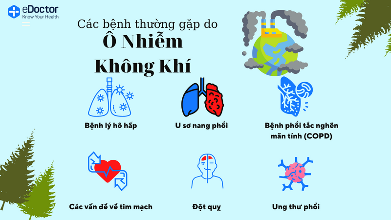 Bệnh phổi tắc nghẽn mạn tính (COPD): Nguyên nhân chính gây bệnh phổi tắc nghẽn mạn tính là tiếp xúc lâu với các chất gây ô nhiễm không khí. Ô nhiễm không khí cũng là tác nhân làm trầm trọng bệnh COPD. Khi tiếp xúc các hạt ô nhiễm, bệnh nhân mắc COPD dễ bị phát bệnh, cấp cứu, thậm chí có nhiều trường hợp tử vong trong hoàn cảnh khắc nghiệt. Ở các nước kém phát triển, COPD chủ yếu xảy ra do sử dụng than để nấu ăn, sưởi ấm…
