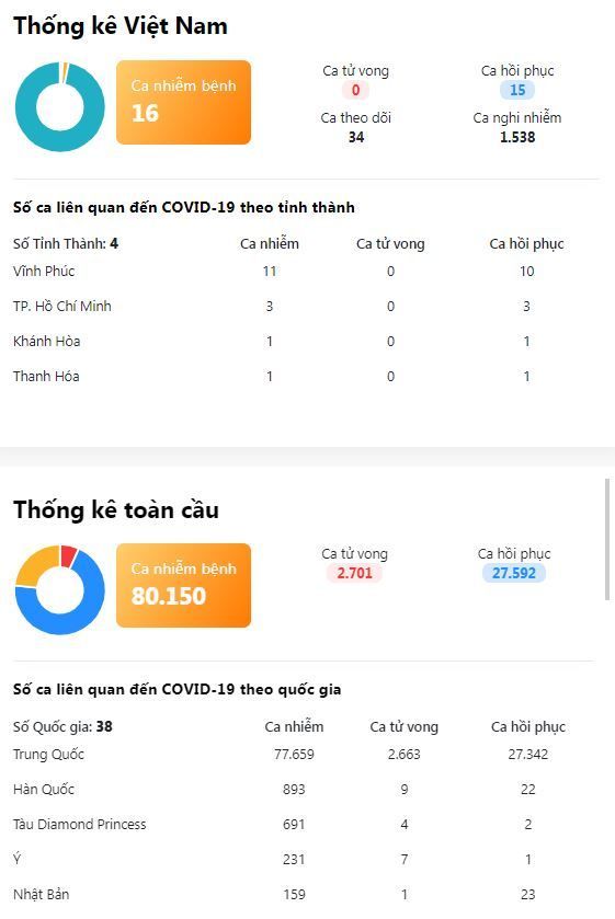Thế giới: 80.150 người mắc, 2.701 người tử vong, trong đó: