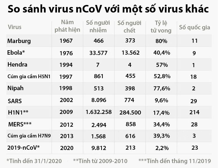 Bảng thống kê dưới đây so sánh dịch bệnh do virus nCoV với một số dịch bệnh khác trên thế giới xảy ra trong khoảng 50 năm qua. Bảng thống kê chưa bao gồm các virus từ muỗi như Zika và Dengue.