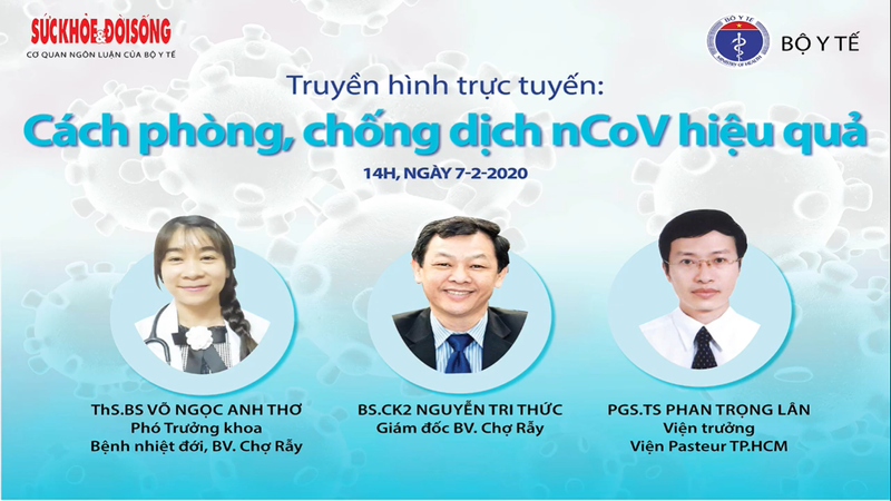 Báo điện tử Sức khỏe&Đời sống tổ chức buổi tư vấn truyền hình trực tuyến với chủ đề "Cách phòng, chống dịch nCoV hiệu quả" vào 14h00 thứ Sáu, ngày 07/02/2020. Chương trình được phát trực tiếp trên báo điện tử Suckhoedoisong.vn, trên kênh Youtube và fanpage của báo Sức khoẻ&Đời sống.