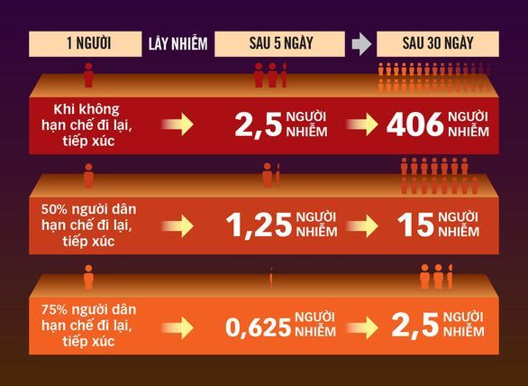 “Theo nghiên cứu của các nhà khoa học, nếu không có giải pháp hạn chế đi lại, tiếp xúc, từ một người bệnh sau 30 ngày sẽ lây nhiễm cho thêm hơn 400 người. Còn nếu hạn chế được 50% người dân đi lại, tiếp xúc thì sau 30 ngày chỉ có thêm 15 người nhiễm. Nếu hạn chế được 75% người dân đi lại, tiếp xúc thì sau 30 ngày chỉ có thêm 3 người nhiễm.