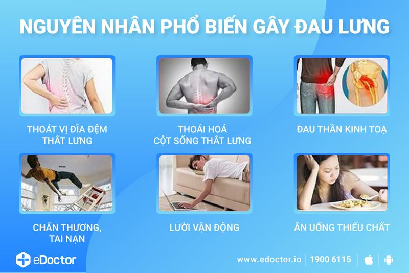Những vấn đề xảy ra với bất kỳ bộ phận nào kể trên đều có thể dẫn đến đau lưng. Trong một số trường hợp đau lưng, nguyên nhân vẫn chưa rõ ràng. Tuy nhiên, hầu hết chúng ta bị đau lưng là do căng thẳng, tư thế ngồi và vận động không đúng hoặc đang gặp phải một số bệnh lý gây đau lưng.