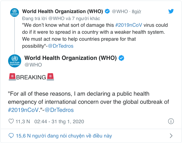 - WHO chính thức tuyên bố dịch virus nCoV là tình trạng y tế KHẨN CẤP TOÀN CẦU (public health emergency of international concern) PHEIC